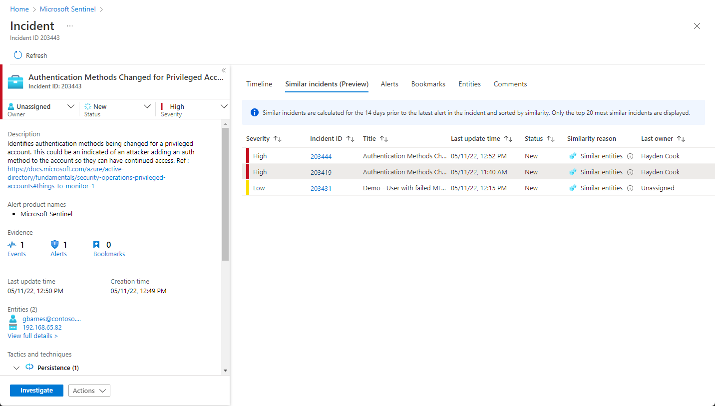 事件详细信息页中的“相似事件”选项卡目前为预览版,其中显示与当前事件最相似的其他最多 20 个事件。 相似度由内部 Microsoft Sentinel 算法计算,事件将按相似度的降序排列和显示。