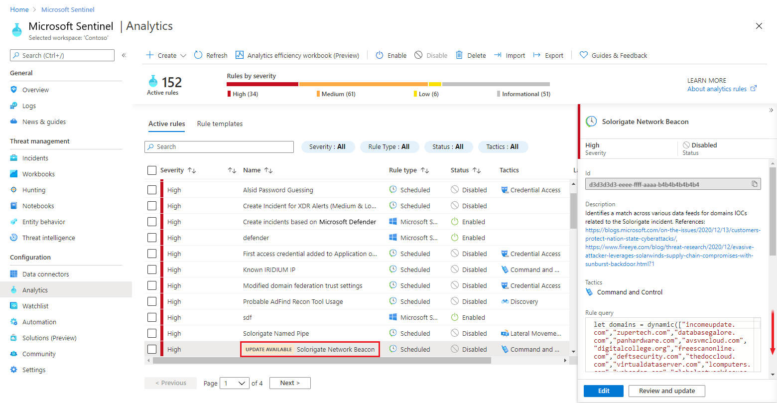 Microsoft Sentinel 包含分析规则模板,你可以通过有效地创建这些模板的副本将其转化为活动规则,这就是从模板创建规则时发生的行为。 但那时,活动规则不再连接到模板。 如果 Microsoft 工程师或其他任何人对规则模板进行了更改,则此前从该模板创建的任何规则将不会动态更新以匹配新模板。