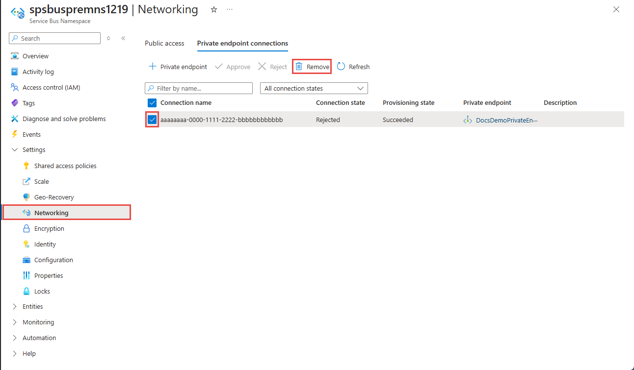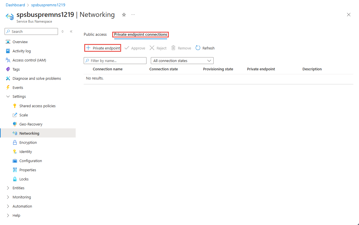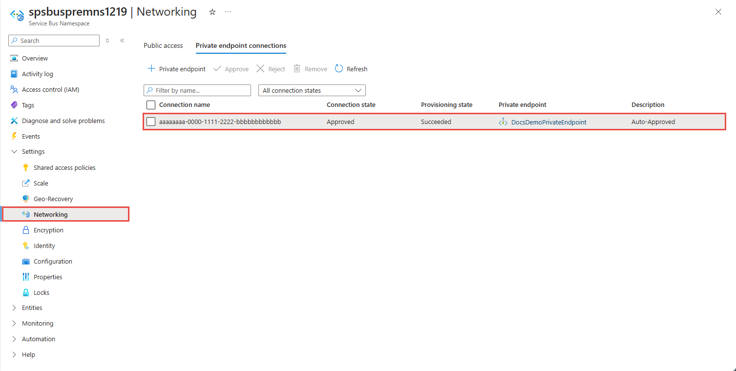 确认已创建专用终结点。 如果你是资源的所有者,在服务总线命名空间的“网络”页面上,终结点连接应自动批准。 如果它处于“挂起”状态,请参阅使用 Azure 门户管理专用终结点部分。