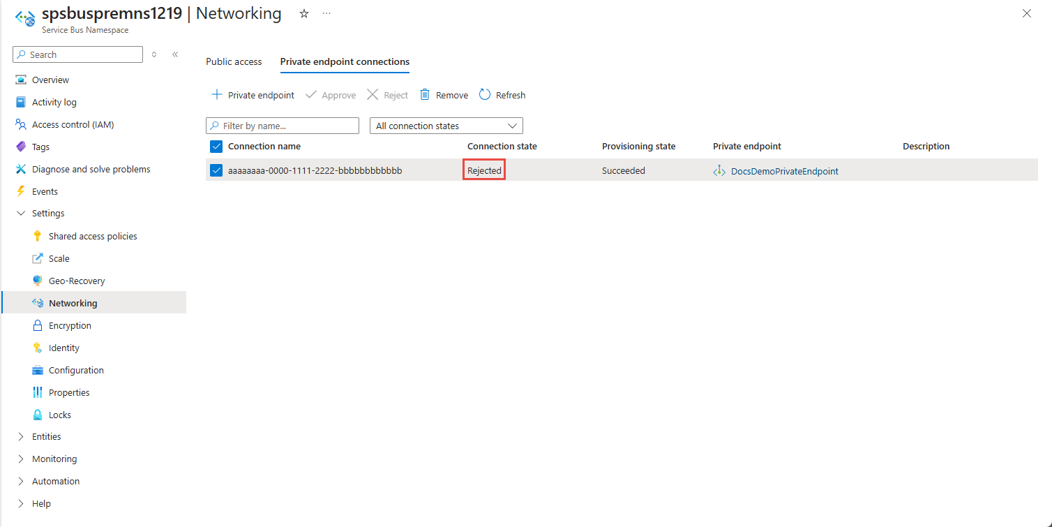 如果要拒绝任何专用终结点连接(不管是挂起的请求还是此前已批准的现有连接),请选择该终结点连接并选择“拒绝”按钮。