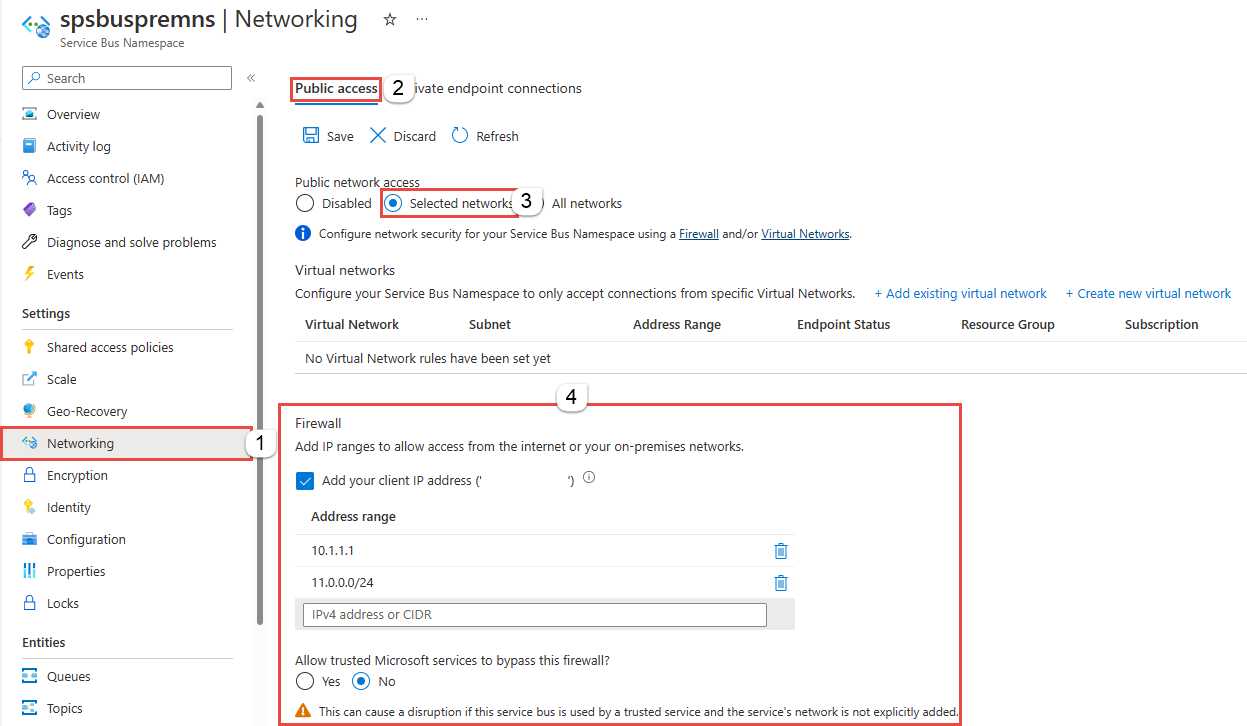 如果选择“ 所选网络 ”选项,并且不会在此页上添加至少一个 IP 防火墙规则或虚拟网络,则无法通过公共 Internet 访问命名空间(使用访问密钥)。