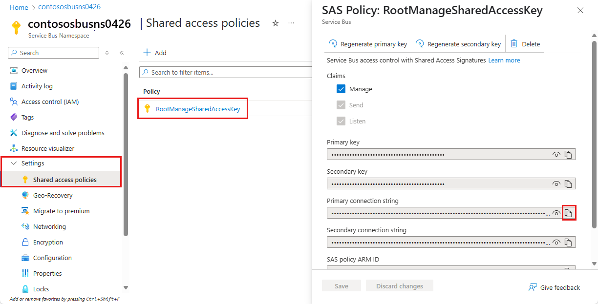 可以使用此页面复制主密钥、辅助密钥、主连接字符串和辅助连接字符串。