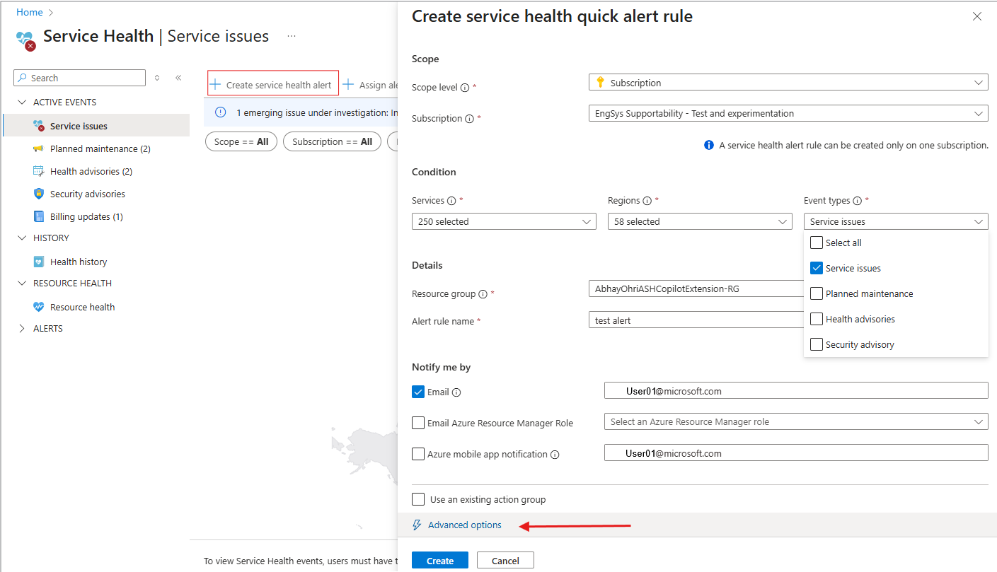 - 选择“ 创建 ”以完成警报,或者如果要添加服务运行状况警报的更多详细信息,请选择“ 高级选项” 以向警报添加更多信息。