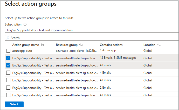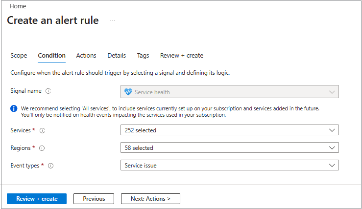建议在配置服务运行状况警报时选择 所有服务和所有区域 。 服务健康状态只有在事件影响到您服务运行的区域时才会触发警报。 因此,选择所有内容不会导致未使用服务或区域的警报。