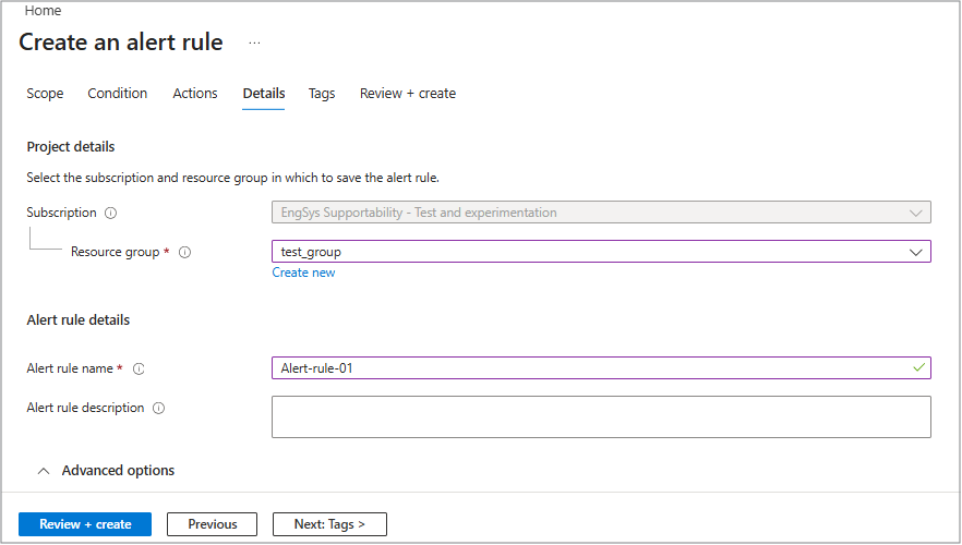 在“ 详细信息 ”选项卡上,按 订阅 和 资源组设置项目的详细信息。 然后,为警报定义 警报规则名称 ,并根据需要添加说明,以便进行更多说明。