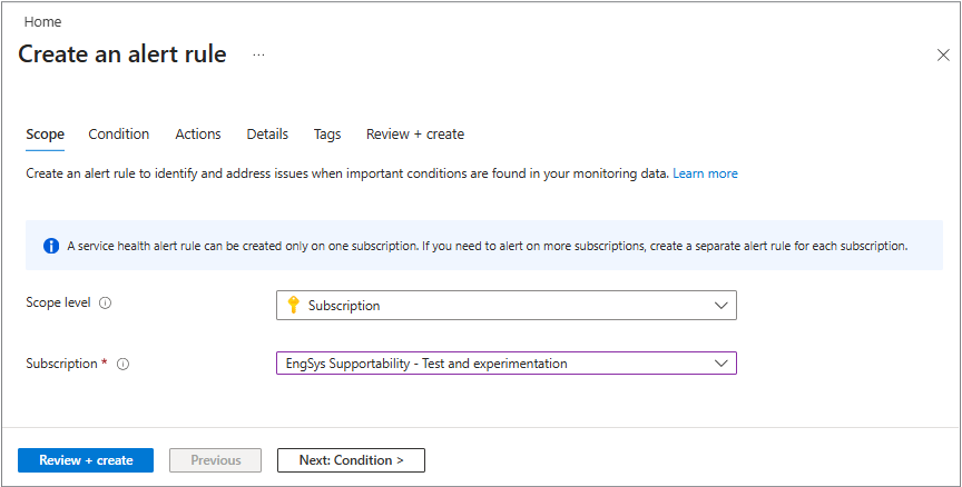 警报基于通知类型、受影响的订阅、租户目录、服务和区域。 它们是使用 Azure 门户的服务运行状况接口创建的。