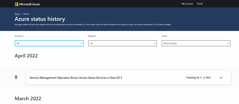 尽管 Azure 状态 页显示最新的运行状况信息,但可以在 Azure 状态历史记录 窗格中查看较旧的事件。 Azure 状态历史记录页用于为方案 1 事件提供事后事件评审(PIR)。