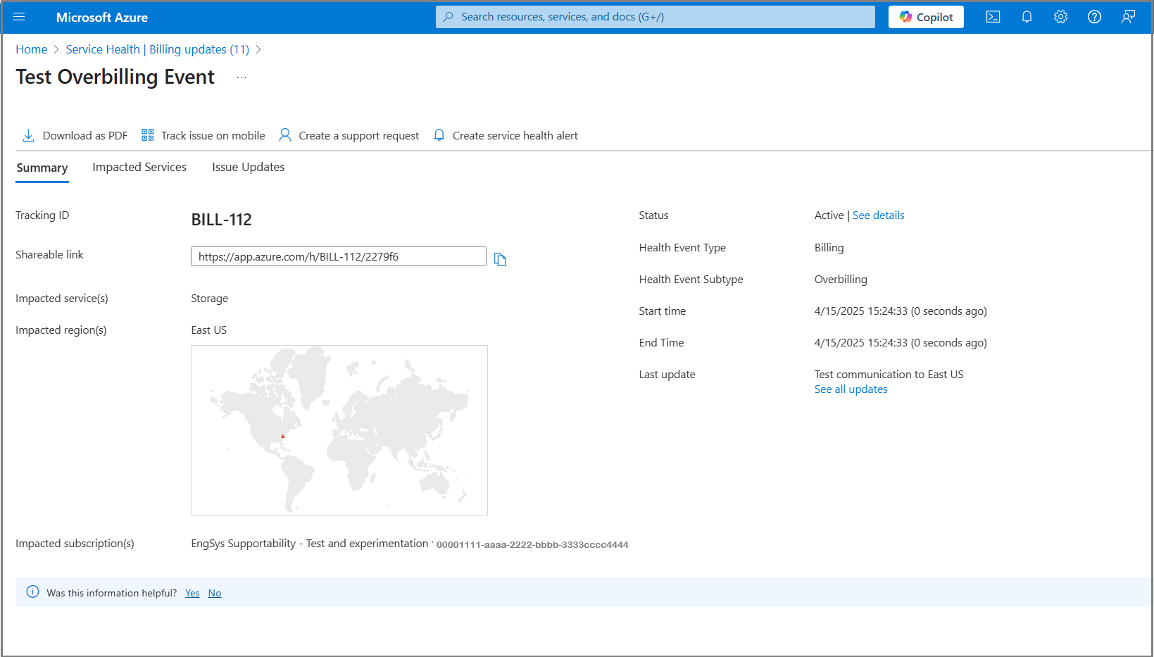 计费通信事件类型的详细信息页面显示在服务运行状况的“计费更新”窗格中。 只有具有提升访问权限的用户才能打开窗格。