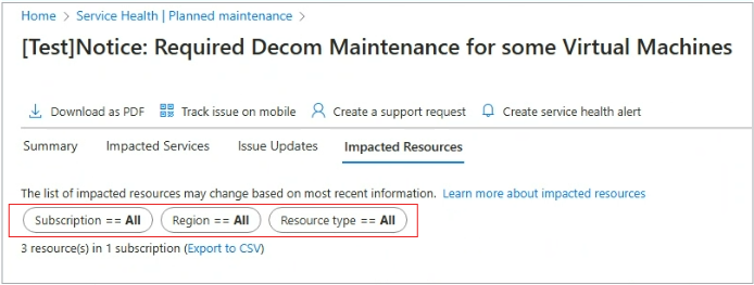 - 通过服务运行状况门户提供计划内维护的受影响资源信息。