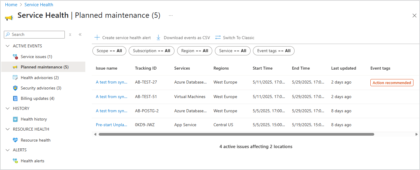 服务运行状况提供有关受计划内维护事件影响的资源的信息: