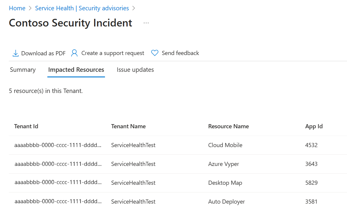 以下示例显示了一个安全公告,其中包含来自订阅和租户范围的受影响资源。