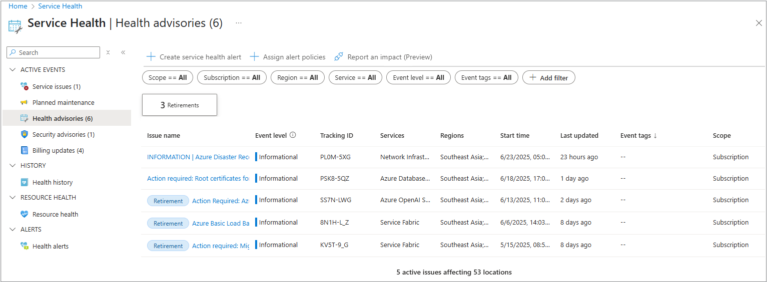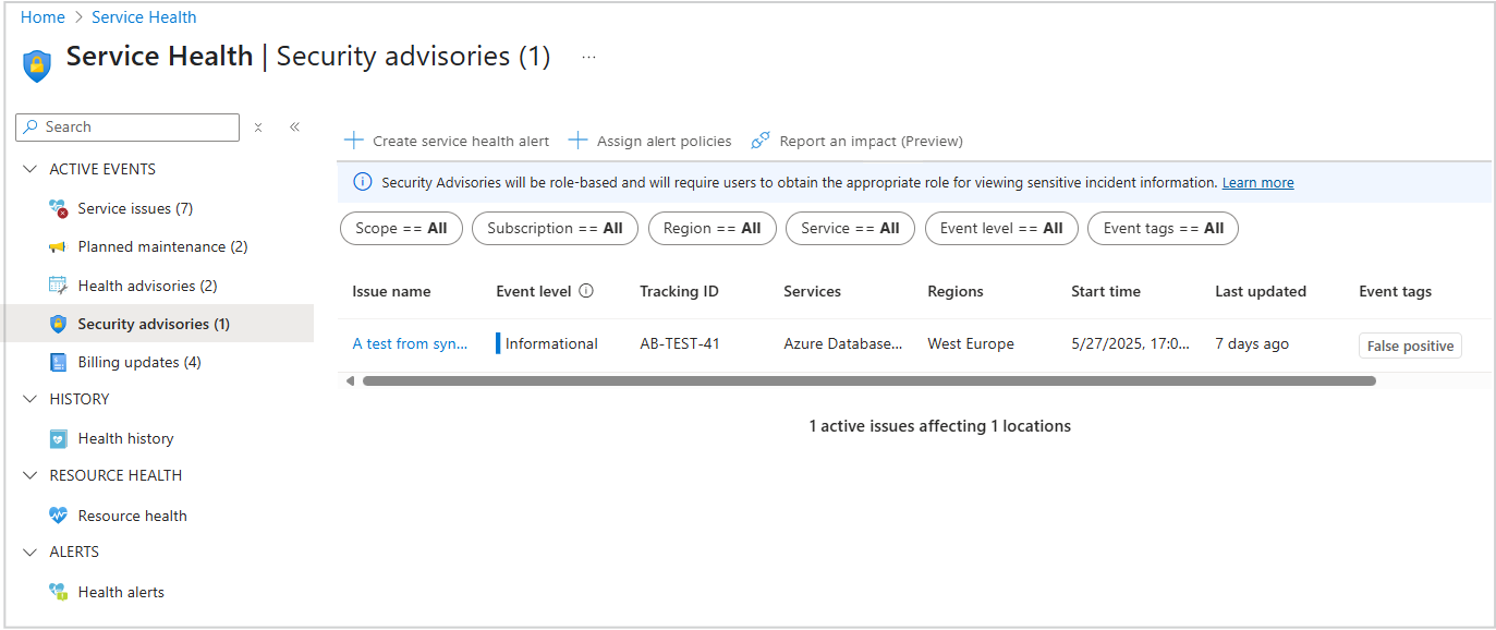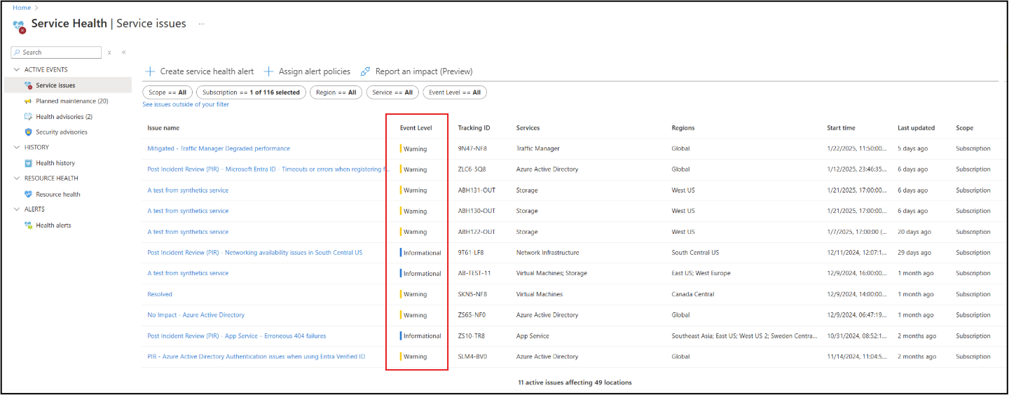 为了帮助你确定 Azure 服务运行状况事件通信的优先级, 服务问题、运行状况公告 和安全 公告 窗格包括名为 “事件级别”的新元数据字段。 此字段可帮助你了解每个通信的重要性,并快速评估每个警报的重要性。
