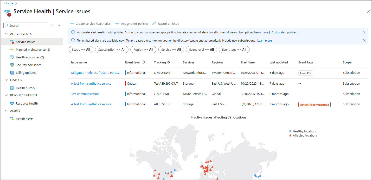 服务运行状况提供你使用的 Azure 服务和区域的运行状况个性化视图,从而提供有关中断、计划内维护和运行状况公告的影响服务的通信。 通过设置服务运行状况警报,可以通过首选的通信渠道接收有关可能影响 Azure 资源的问题或更改的通知。