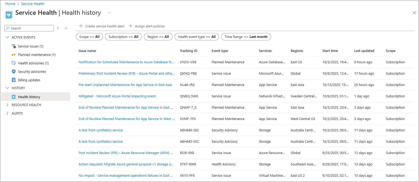 - 服务健康状况事件在订阅范围内时会显示在活动日志中(例如,服务问题、计划维护、健康公告)。
