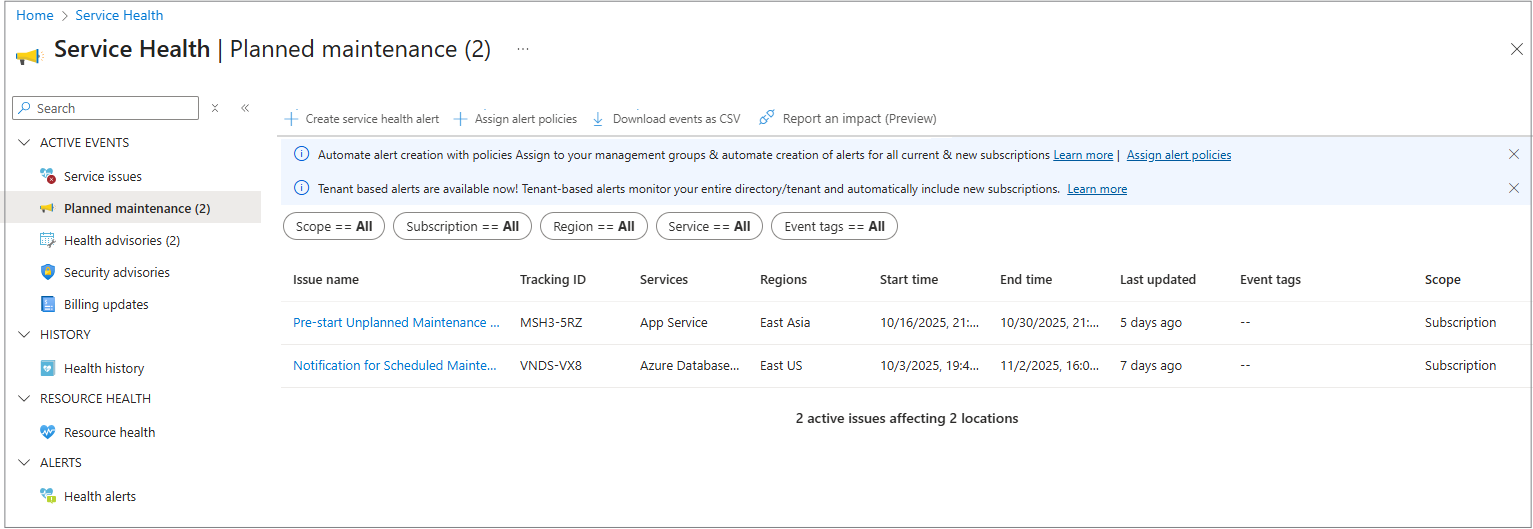 Azure 服务运行状况中的“计划内维护”窗格是 Azure 门户中的一个专用部分,可让你了解即将进行的维护活动。 它突出显示可能影响 Azure 资源的事件,帮助你提前做好准备。