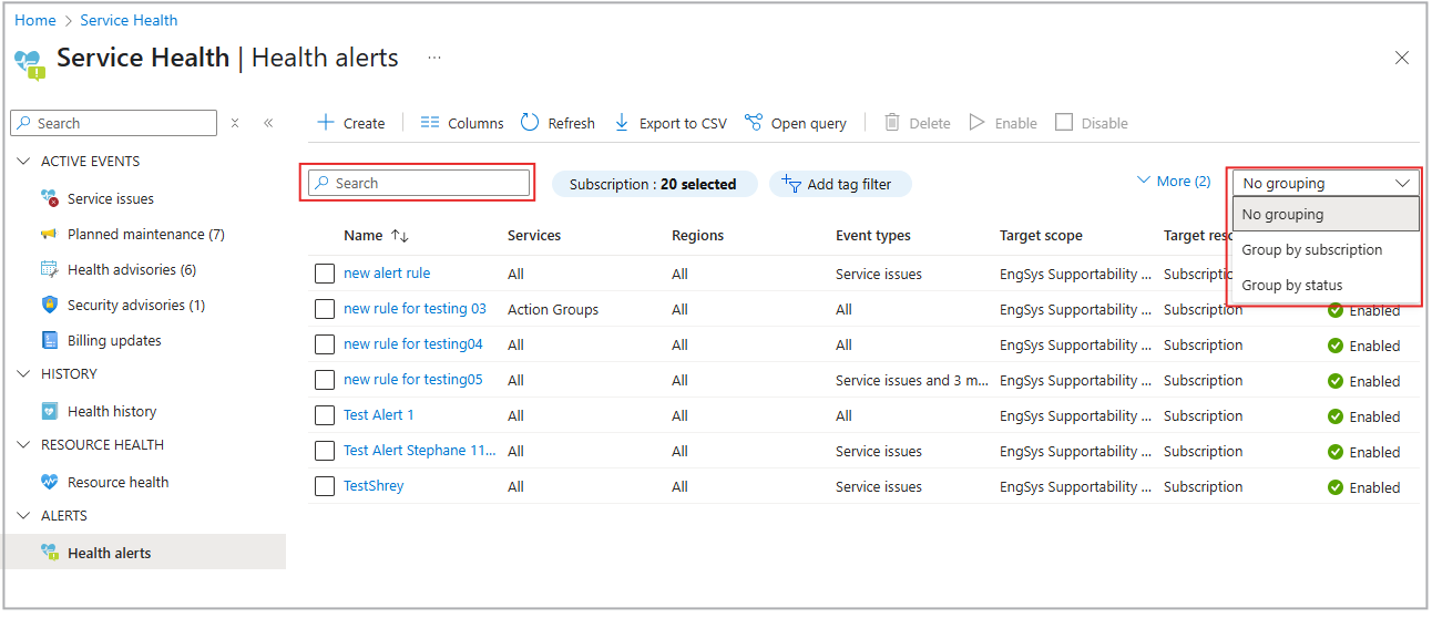 从左侧菜单中选择健康警报以按名称搜索和排序您的警报规则。 还可以按订阅和状态对警报规则进行分组。