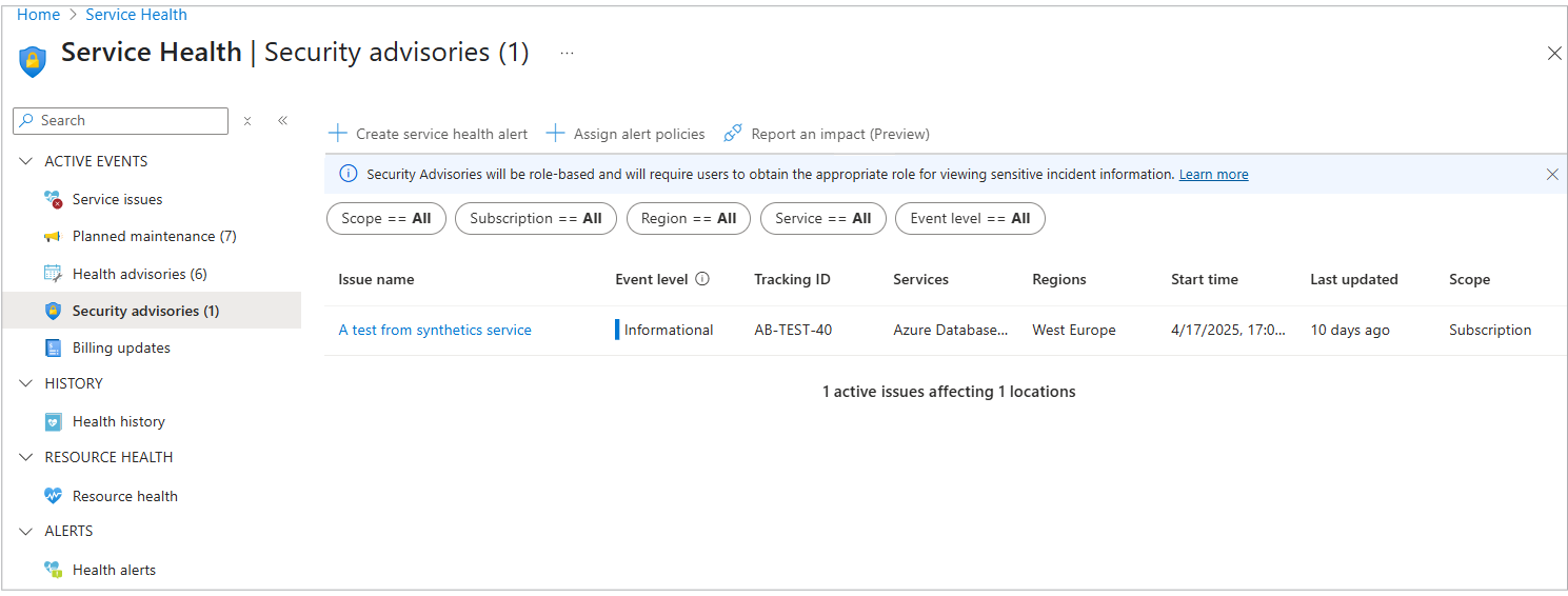 “服务问题”、“运行状况公告”、“安全公告”和“运行状况历史”窗格同时在“租户”和“订阅”层级显示事件。 有关角色的详细信息,请参阅 基于角色的访问控制(RBAC),以了解安全咨询资源的影响。