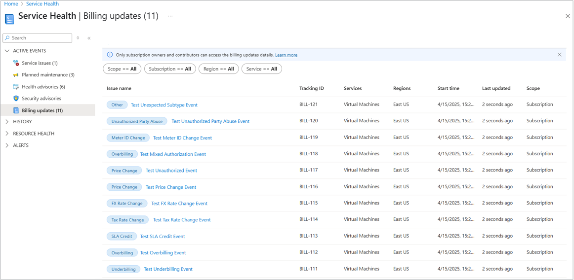 从左侧菜单中选择 “计费更新 ”以查看计费更新。 只有具有订阅所有者或参与者权限的用户才能访问此信息。 有关详细信息,请参阅 计费更新。