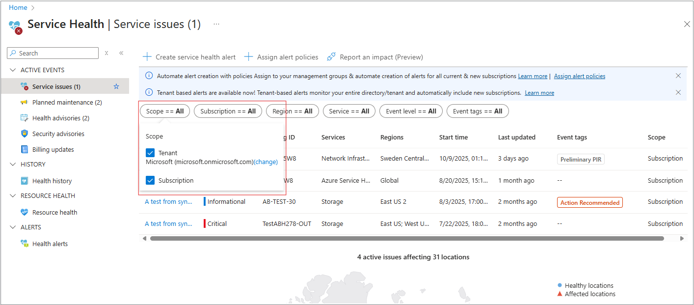 在 “服务问题 ”窗格中,可以按 范围进行筛选。 范围列指示事件何时影响租户级别或订阅级别。