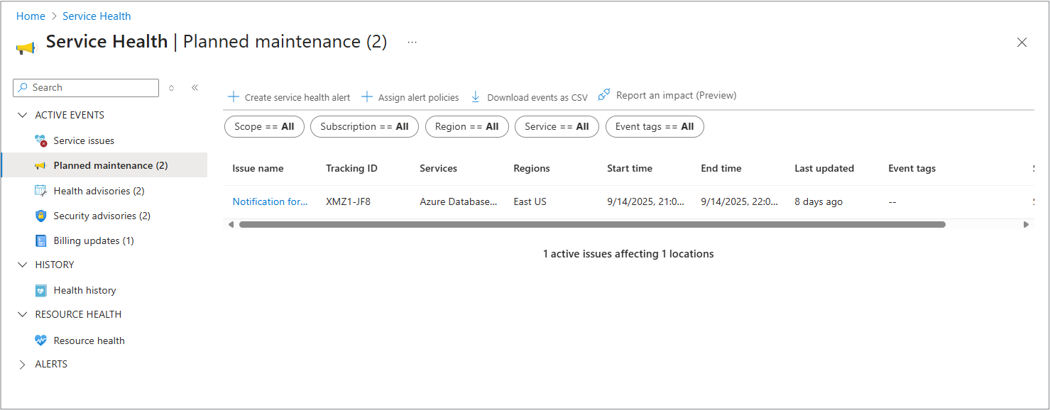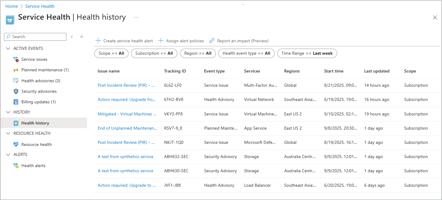 Azure 服务运行状况会在所有事件类型变为非活动状态后将其保留在门户的“运行状况历史记录”部分中长达 90 天。 这些事件在解析或处于非活动状态后,会存档在运行状况历史记录中。 可以按类型、日期和效果筛选和查看它们。
