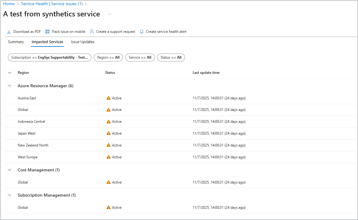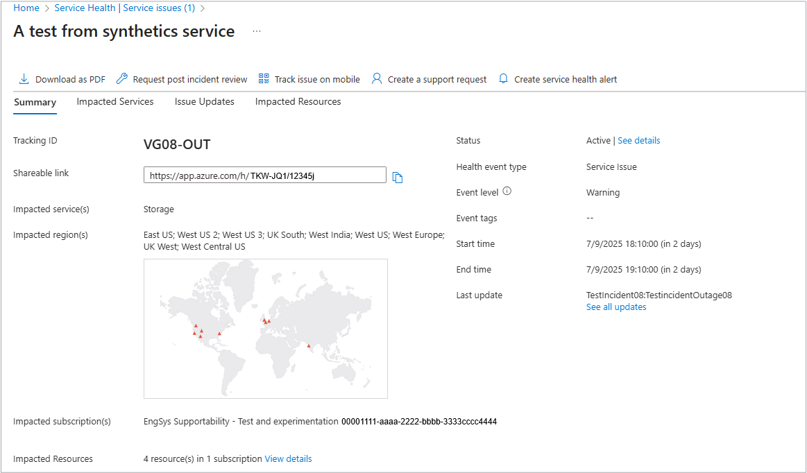 | 受影响的资源 | 受此服务问题影响的资源。 选择 “查看详细信息 ”链接以打开“受影响的资源”选项卡以获取更多详细信息。 |