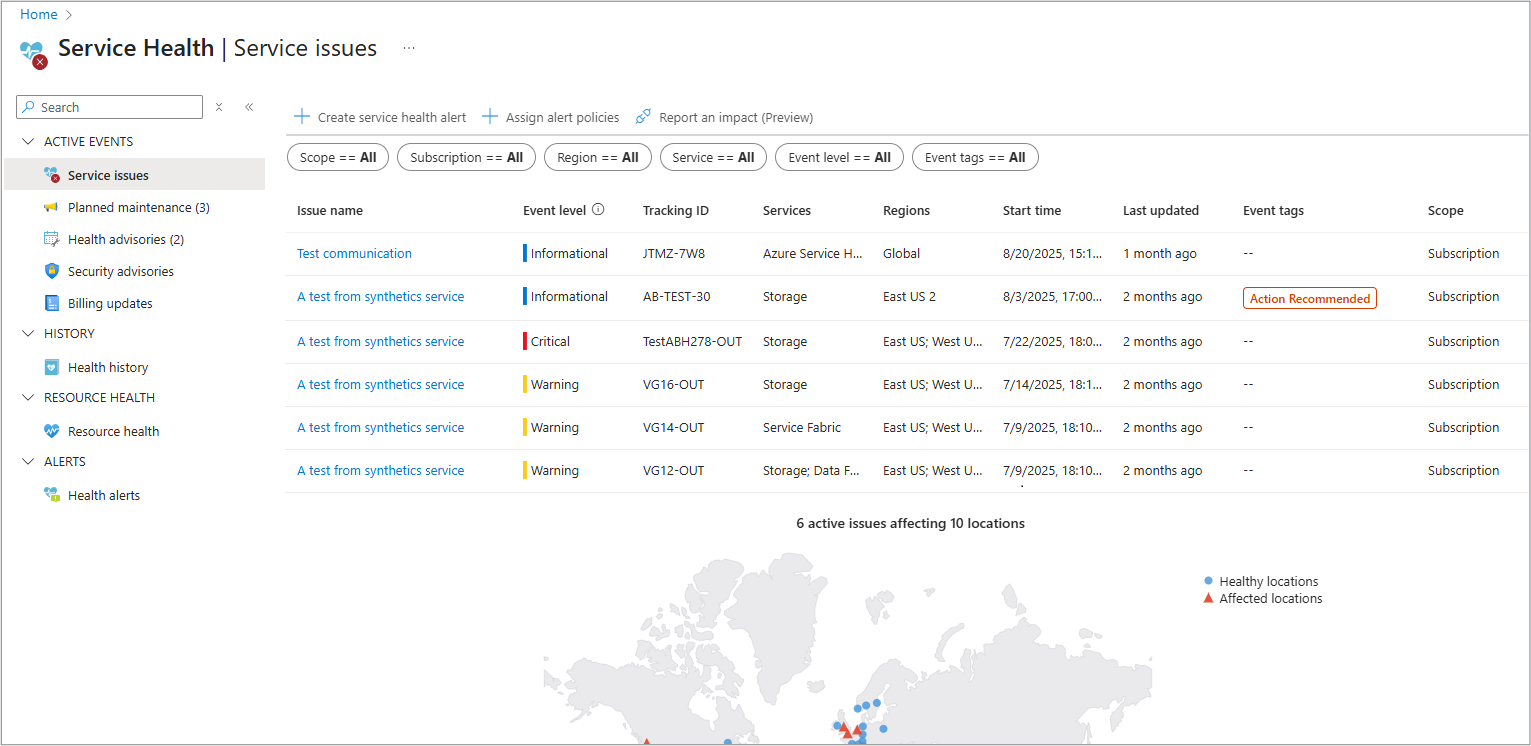 Azure 服务运行状况中的“服务问题”窗格提供了活动 Azure 服务问题的详细实时视图。 它突出显示可能影响你的资源的问题。