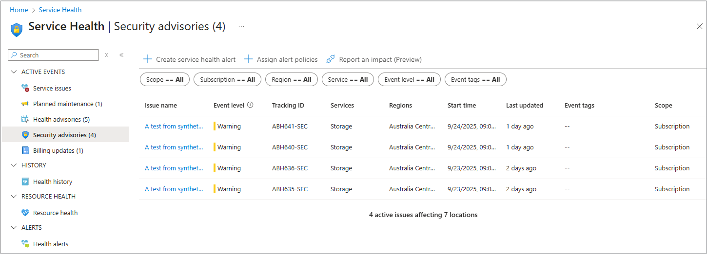 - 在 Azure 门户中的服务运行状况体验中查看这些安全公告,并通过首选渠道获取有关安全公告的通知,方法是为这种类型的通知设置服务运行状况警报。