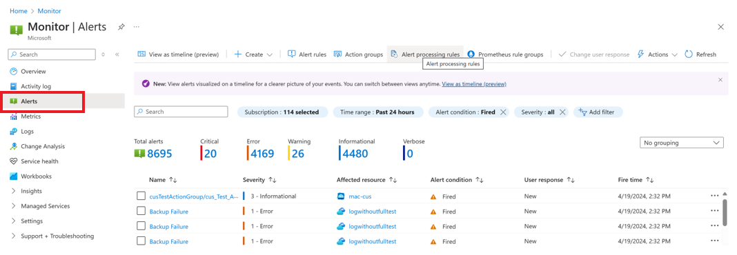转到 Azure Monitor>警报,然后在顶部窗格中选择警报处理规则。