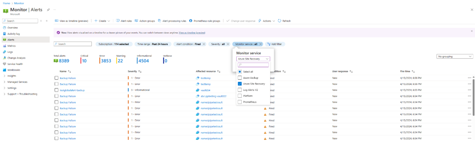 与 Azure Monitor、业务连续性中心和恢复服务保管库一样,也可以查看来自备份中心的警报。