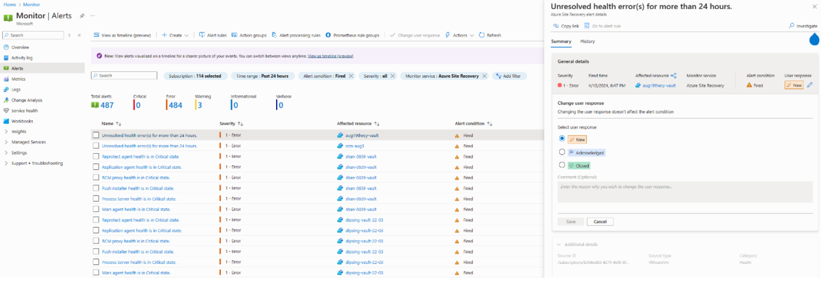 设置监视服务 = Azure Site Recovery 的筛选器,以查看特定于 Azure Site Recovery 的警报。 还可以自定义其他筛选器的值,以查看特定时间范围(长达 30 天)的保管库、订阅、严重性和警报状态(用户响应)的警报。