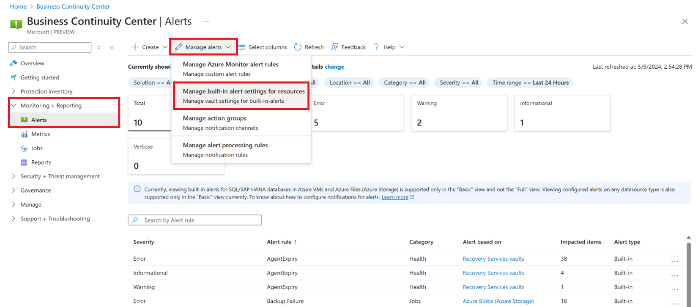 若要管理警报设置,请转到“业务连续性中心”“监视 + 报告”>“警报”选项>。 选择“管理警报”“管理资源的内置警报设置”选项>。