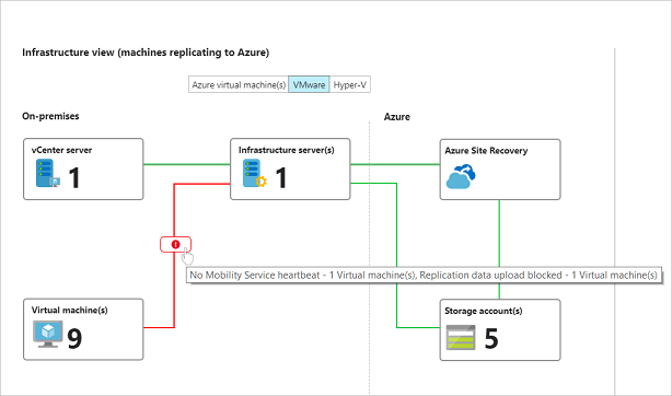 在“基础结构”视图中,监视参与复制的基础结构组件,以及服务器与 Azure 服务之间的连接运行状况。