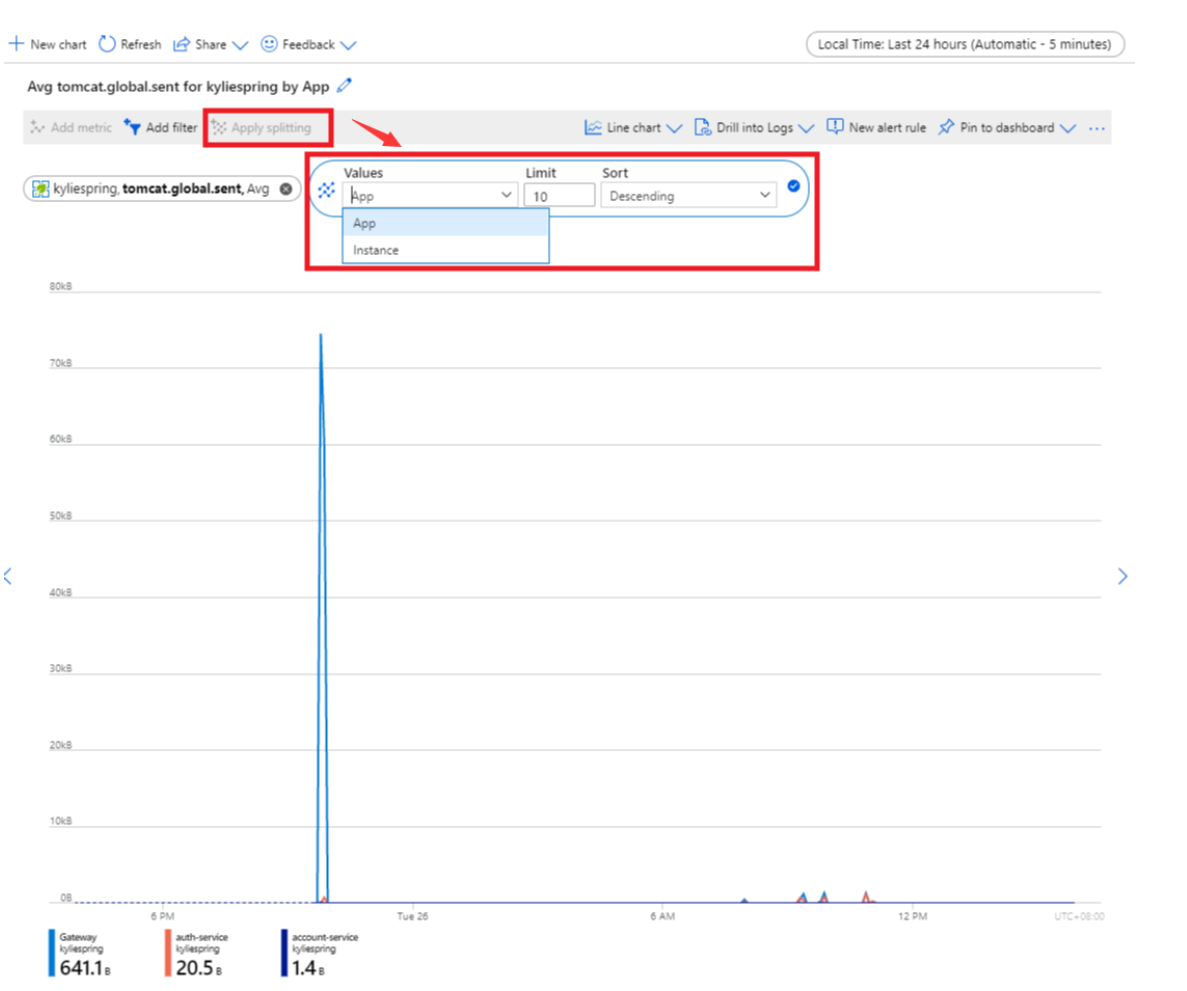 默认视图包括某个 Azure Spring Apps 服务的应用程序的所有指标。 可以在显示中筛选一个应用或实例的指标。 选择“添加筛选器”,将属性设置为“应用”,然后在“值”文本框中选择要监视的目标应用程序 。