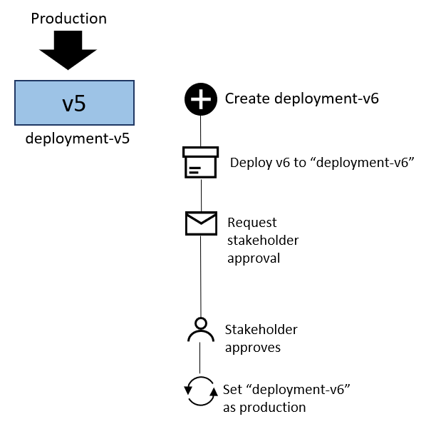在下图中,版本 v5 正在 deployment-v5 部署中运行。 部署名称现在包含版本,因为部署是为此版本专门创建的。 开始时没有其他部署。 现在,若要部署版本 v6,部署管道会创建一个新部署 deployment-v6,并在其上部署应用版本 v6。