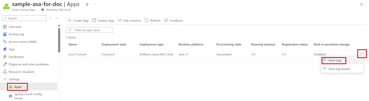 转到 Azure Spring Apps 服务实例的“概述”页面,然后在导航窗格中选择“应用”。