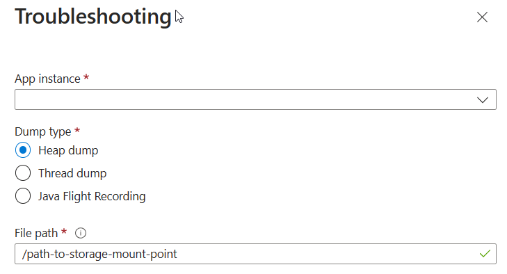 - 你自己的持久存储,如如何在 Azure Spring Apps 中启用你自己的持久存储中所述。 此存储用于保存生成的诊断文件。 你在以下参数值中提供的路径应位于绑定到你的应用的持久存储的装载路径下。 如果要使用装载路径下的路径,请务必事先创建子路径。