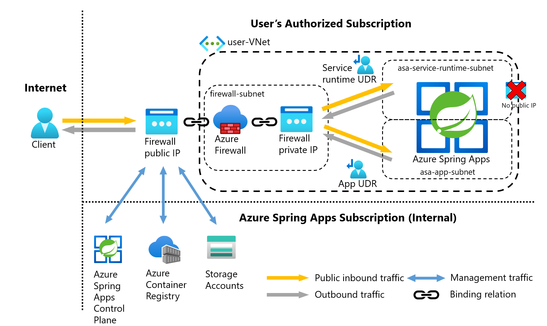 下图显示了使用用户定义的路由 (UDR) 的 Azure Spring Apps 虚拟网络示例。