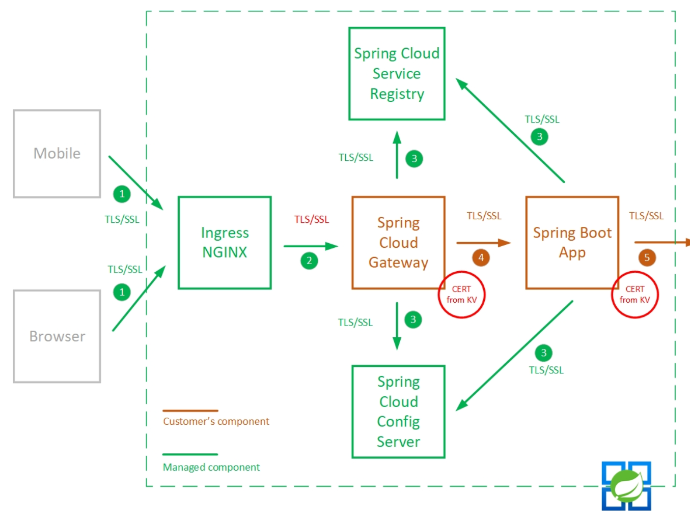 下图显示了 Azure Spring Apps 中的总体安全通信支持。