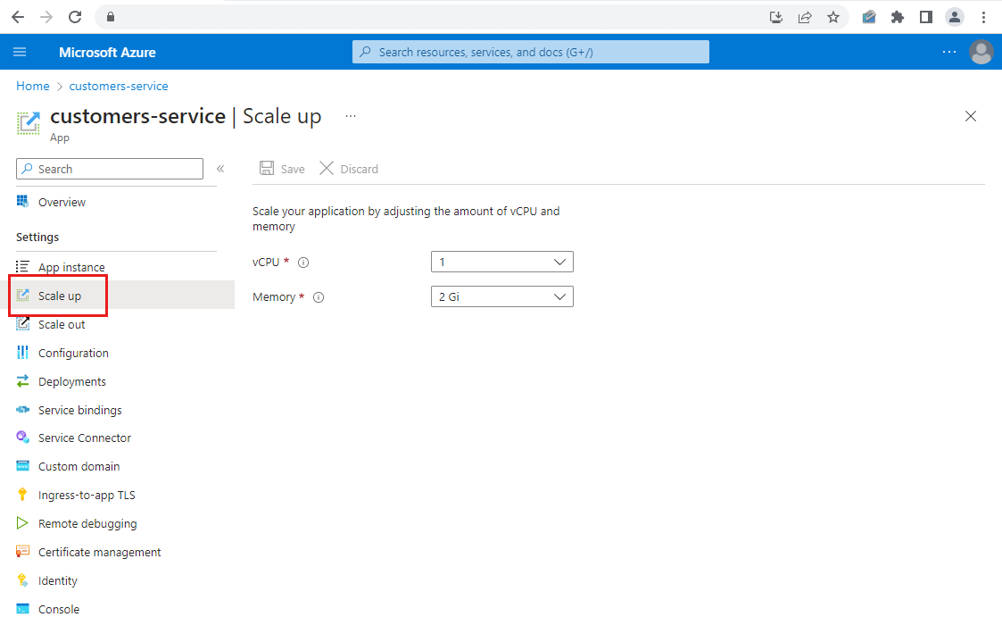 选择要缩放的应用,然后在导航窗格中选择“纵向扩展”。 使用以下部分所述的指南指定“vCPU”和“内存”设置。