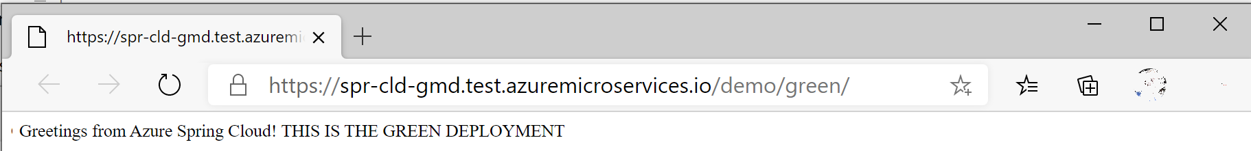 package com.example.hellospring; import org.springframework.web.bind.annotation.RestController; import org.springframework.web.bind.annotation.RequestMapping; @RestController public class HelloController { @RequestMapping("/") public String index() { return "Greetings from Azure Spring Apps! THIS IS THE GREEN DEPLOYMENT"; } }重新生成 .jar 文件: