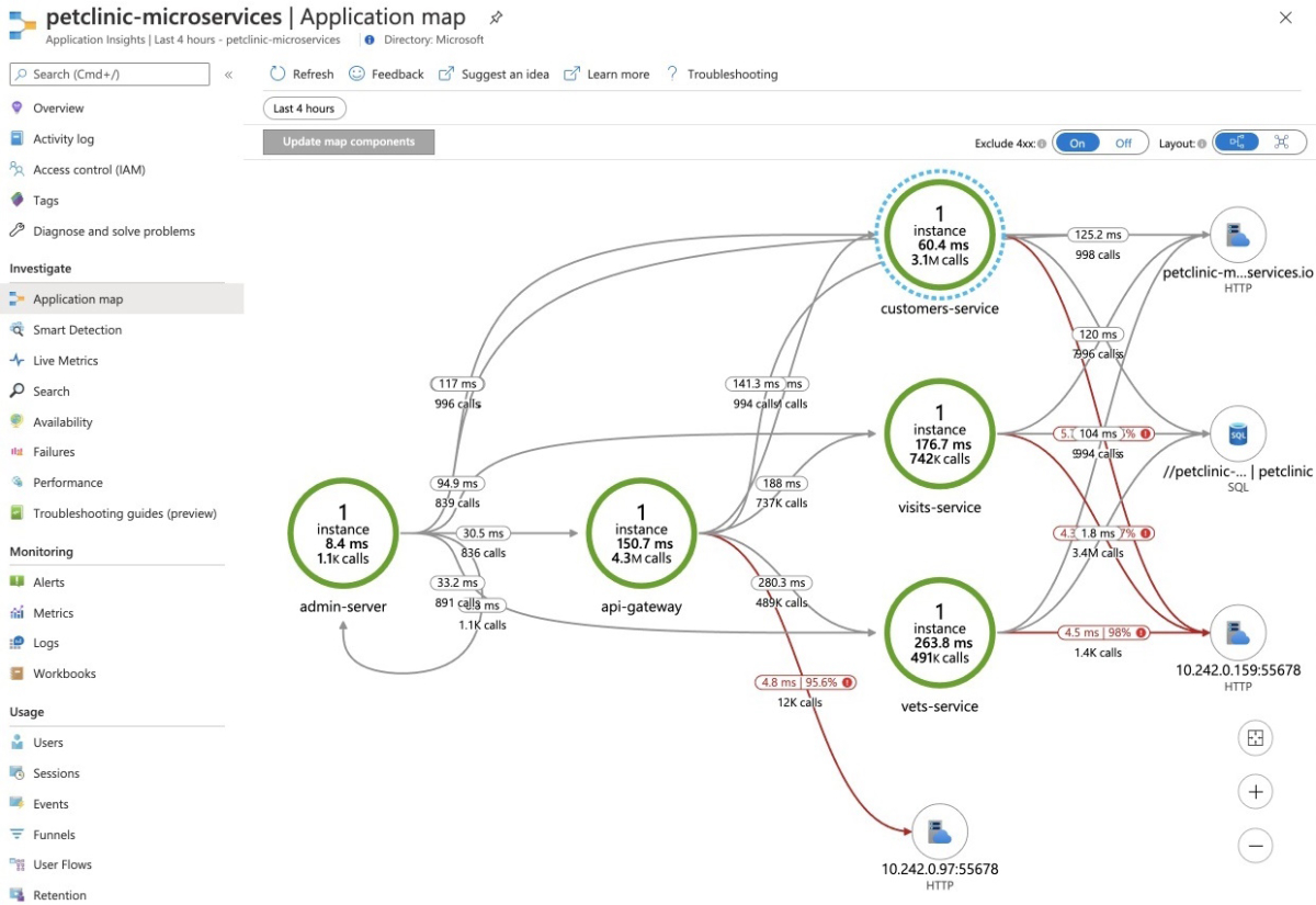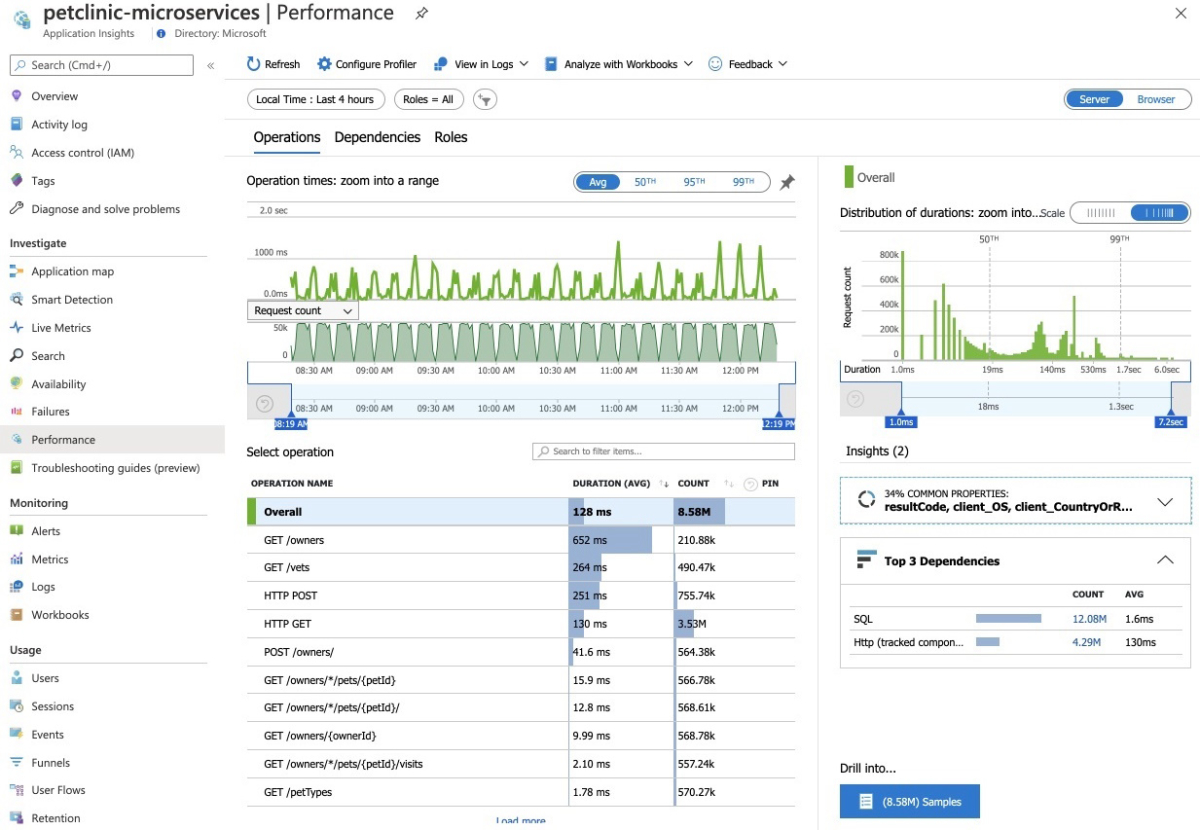 使用 Azure Spring Apps 中的内置监视功能,可以调试和监视复杂问题。 Azure Spring Apps 将 Spring Cloud Sleuth 与 Azure 的 Application Insights 集成。 这种集成可以通过 Azure 门户提供强大的日志、指标和分布式跟踪功能。 以下过程说明如何通过已部署的 PetClinic 应用使用日志流式处理、Log Analytics、指标和分布式跟踪。