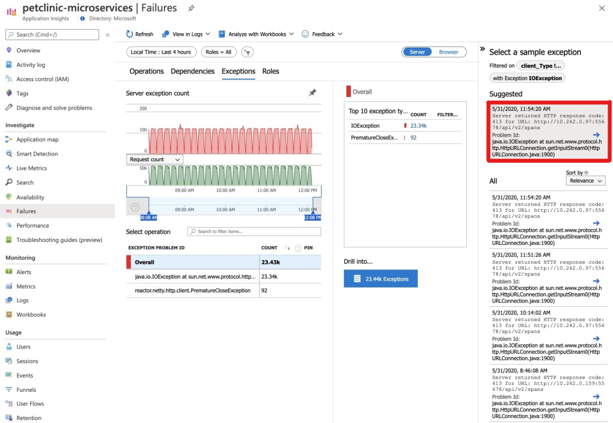 导航到“失败”页的“异常”选项卡,从中可以看到异常的集合: