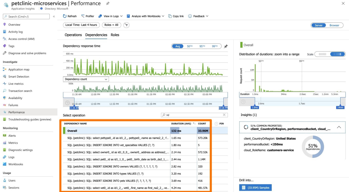 导航到“依赖项”选项卡,从中可以查看依赖项的性能数,尤其是 SQL 调用: