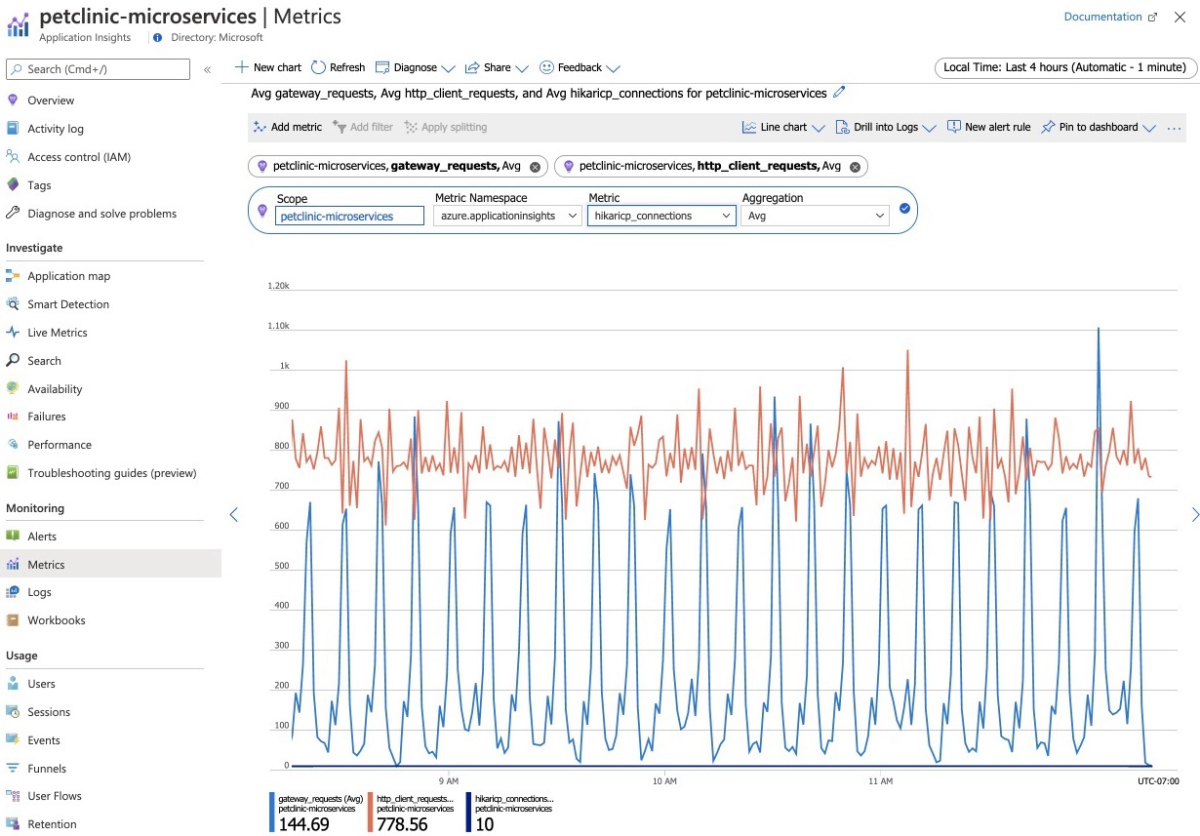 导航到“Application insights”页,然后导航到“指标”页。 可以看到由 Spring Boot 应用、Spring 模块和依赖项提供的指标。