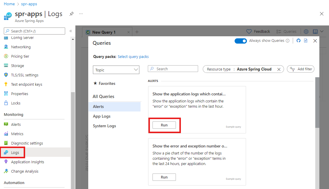 在“显示包含‘错误’或‘异常’术语的应用程序日志”下的“查询”窗格中,选择“运行”。