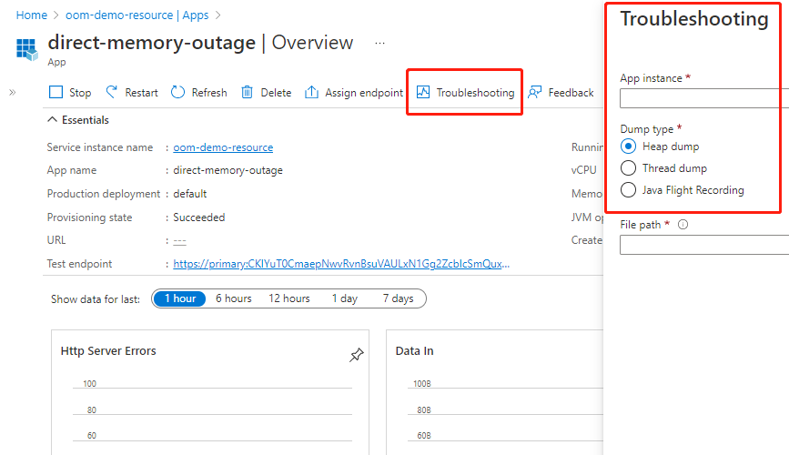 若要进一步调试,可以手动捕获堆转储和线程转储,并使用 Java Flight Recorder (JFR)。 有关详细信息,请参阅手动获取堆转储和线程转储,然后在 Azure Spring Apps 中使用 Java Flight Recorder。