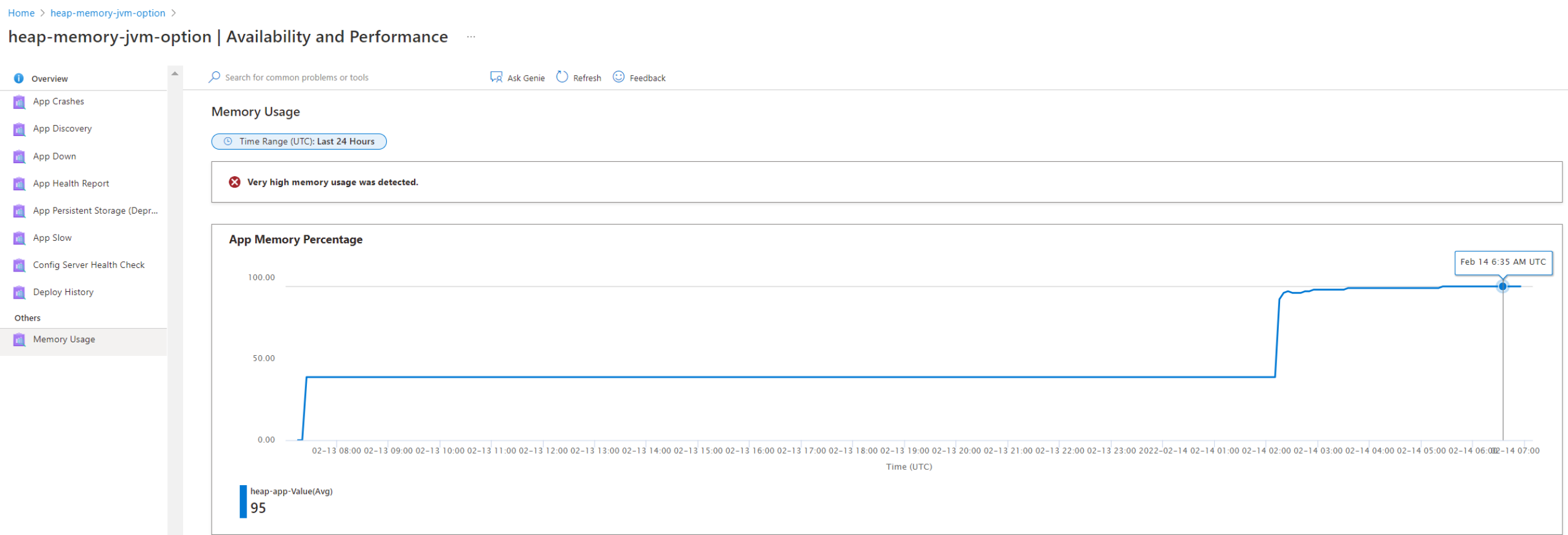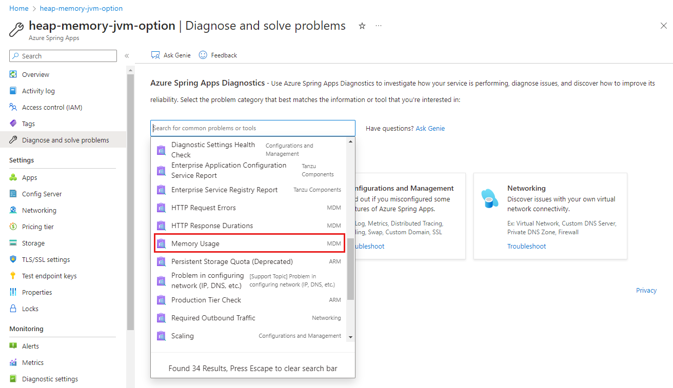 在 Azure 门户中,可在“诊断和解决问题”下找到“内存使用情况”,如以下屏幕截图所示。