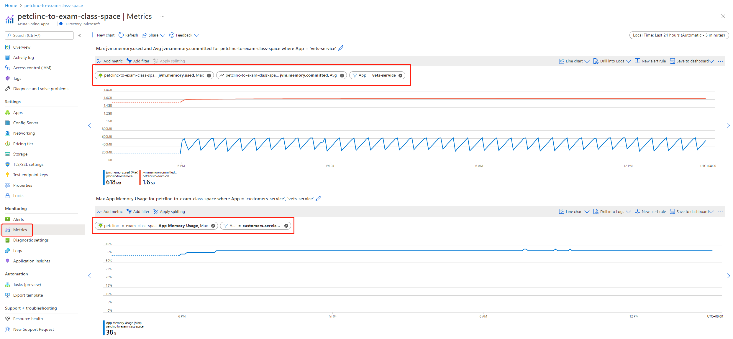 以下部分介绍了涵盖内存使用率高、堆内存过大、垃圾回收异常(频率过高或过低)等问题的指标。 有关详细信息,请参阅快速入门:使用日志、指标和跟踪监视 Azure Spring Apps 应用。