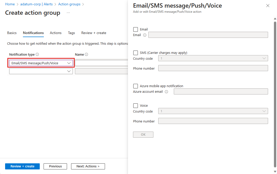 选择“通知”选项卡,然后从下拉菜单中选择“通知类型”。 此操作将打开一个窗格,以定义激活时执行的操作。 此示例显示电子邮件和消息类型。 完成表单,然后选择“确定”。