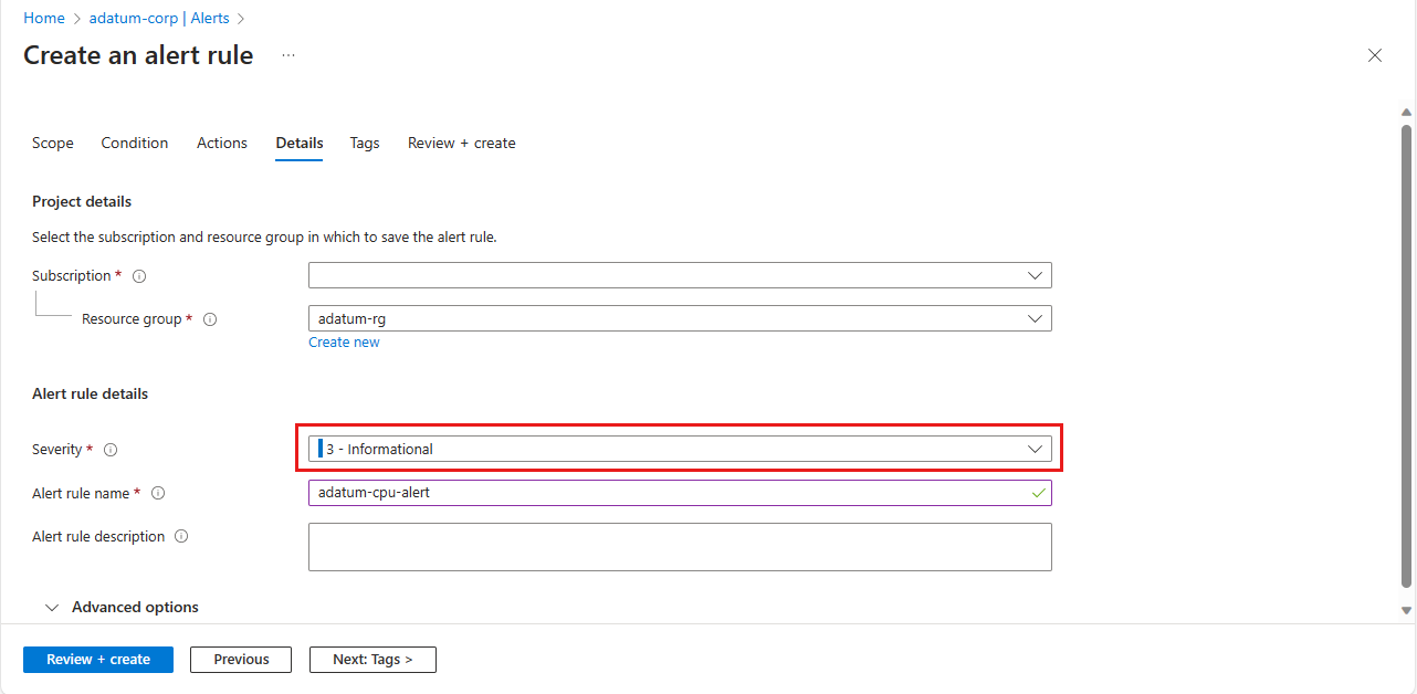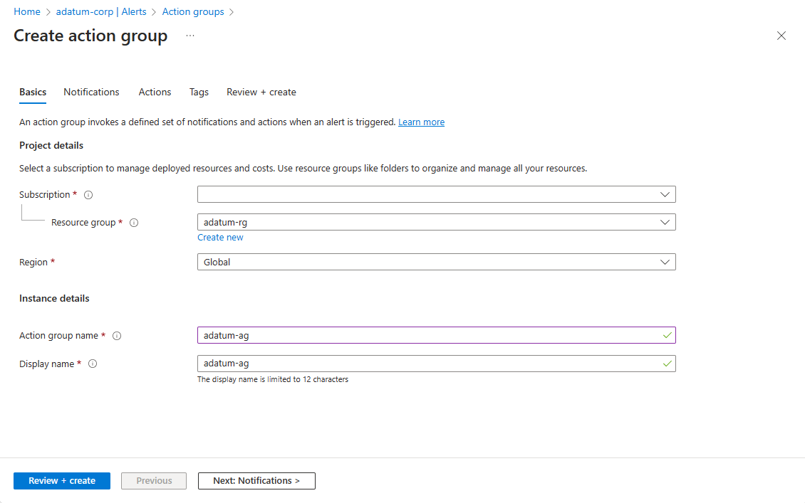在“基本信息”选项卡上的“创建操作组”页中,在“项目详细信息”中进行任何所需的更改。 在“实例详细信息”中,指定“操作组名称”和“显示名称”的设置。